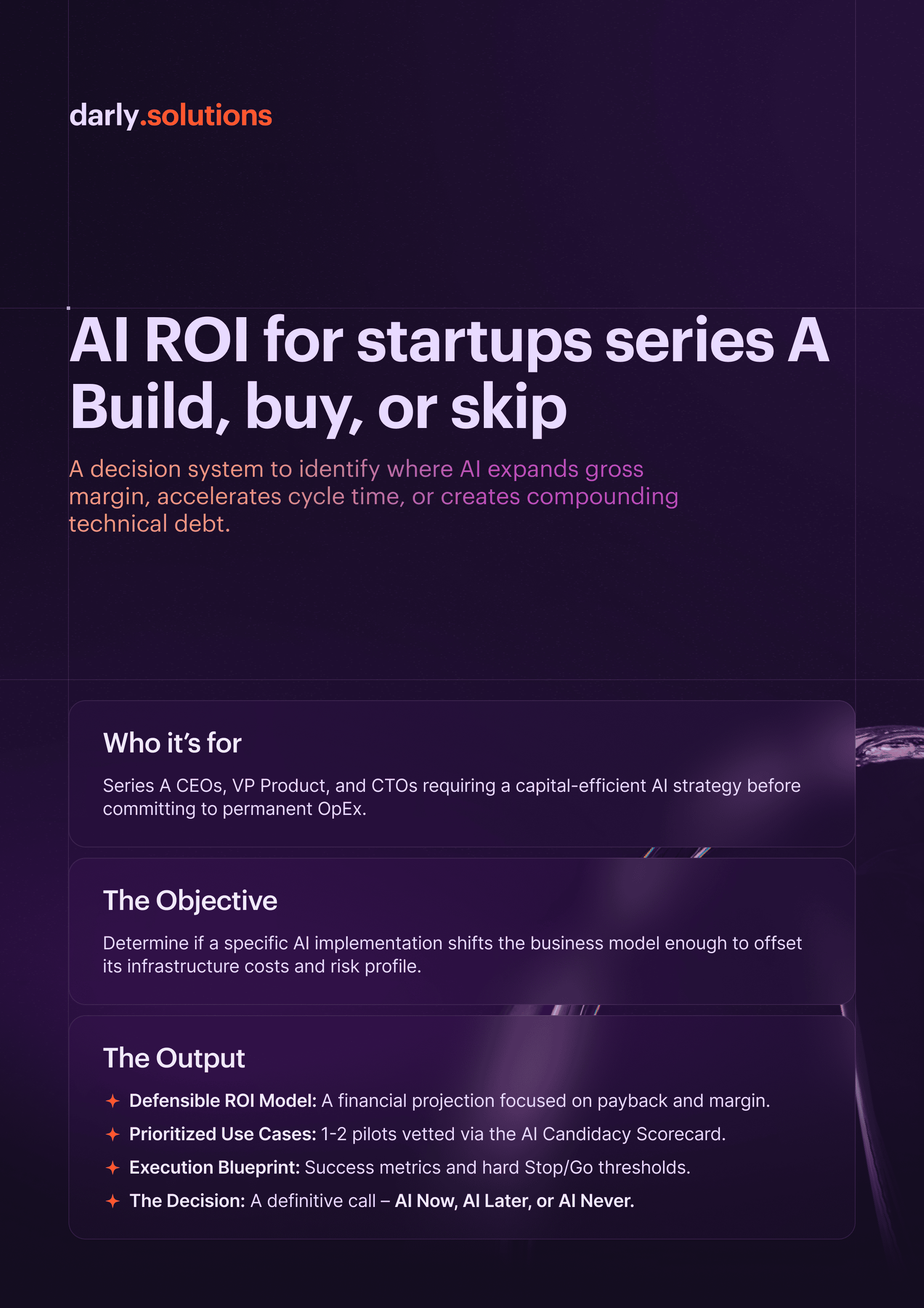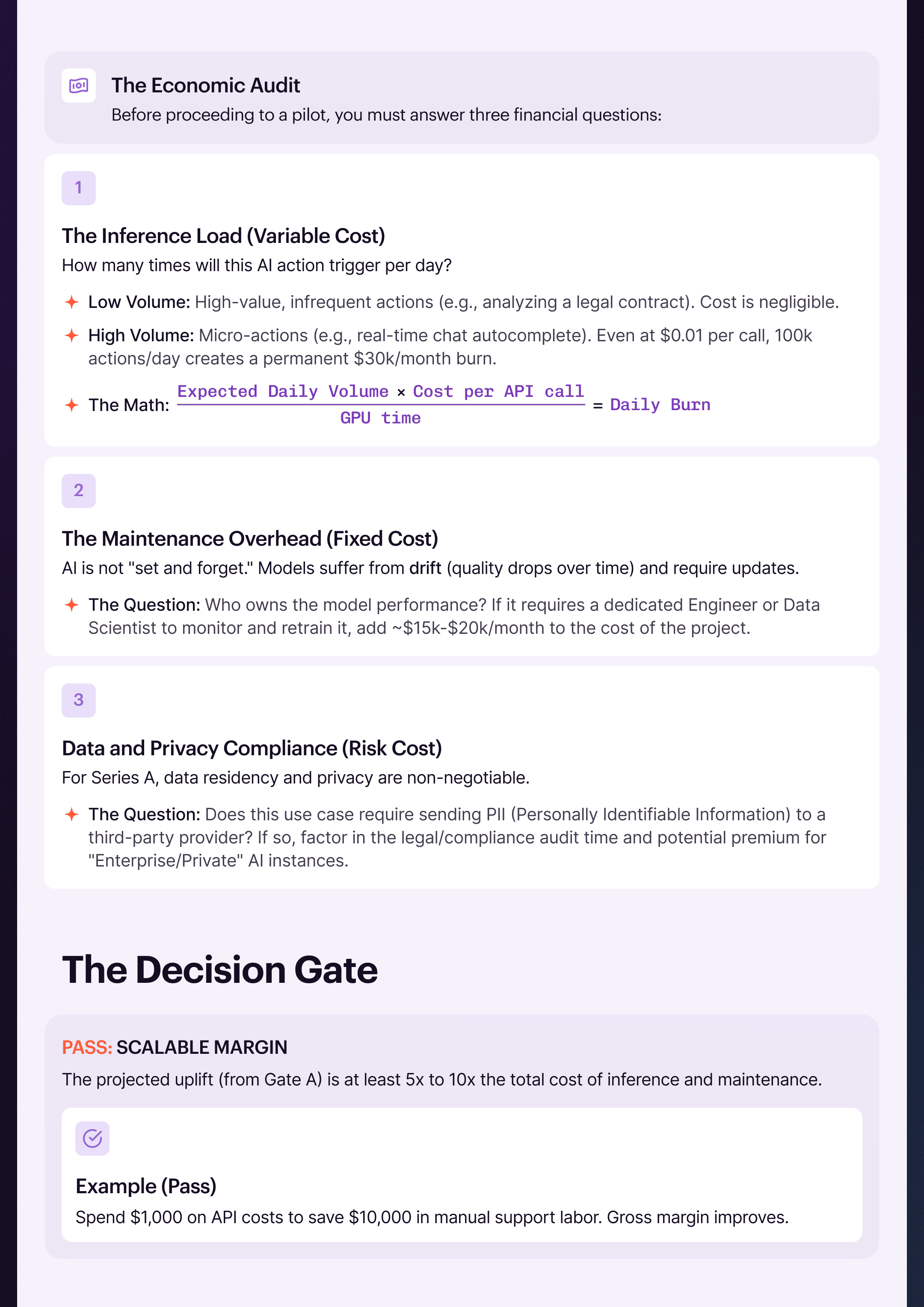 Identify high-margin AI pilots through the "Three-Gate Funnel." Distill value from noise and secure your unit economics with absolute precision. You receive a defensible ROI model, vetted use cases, and clear execution thresholds. This is your system for sustained growth and a permanent technical moat.
