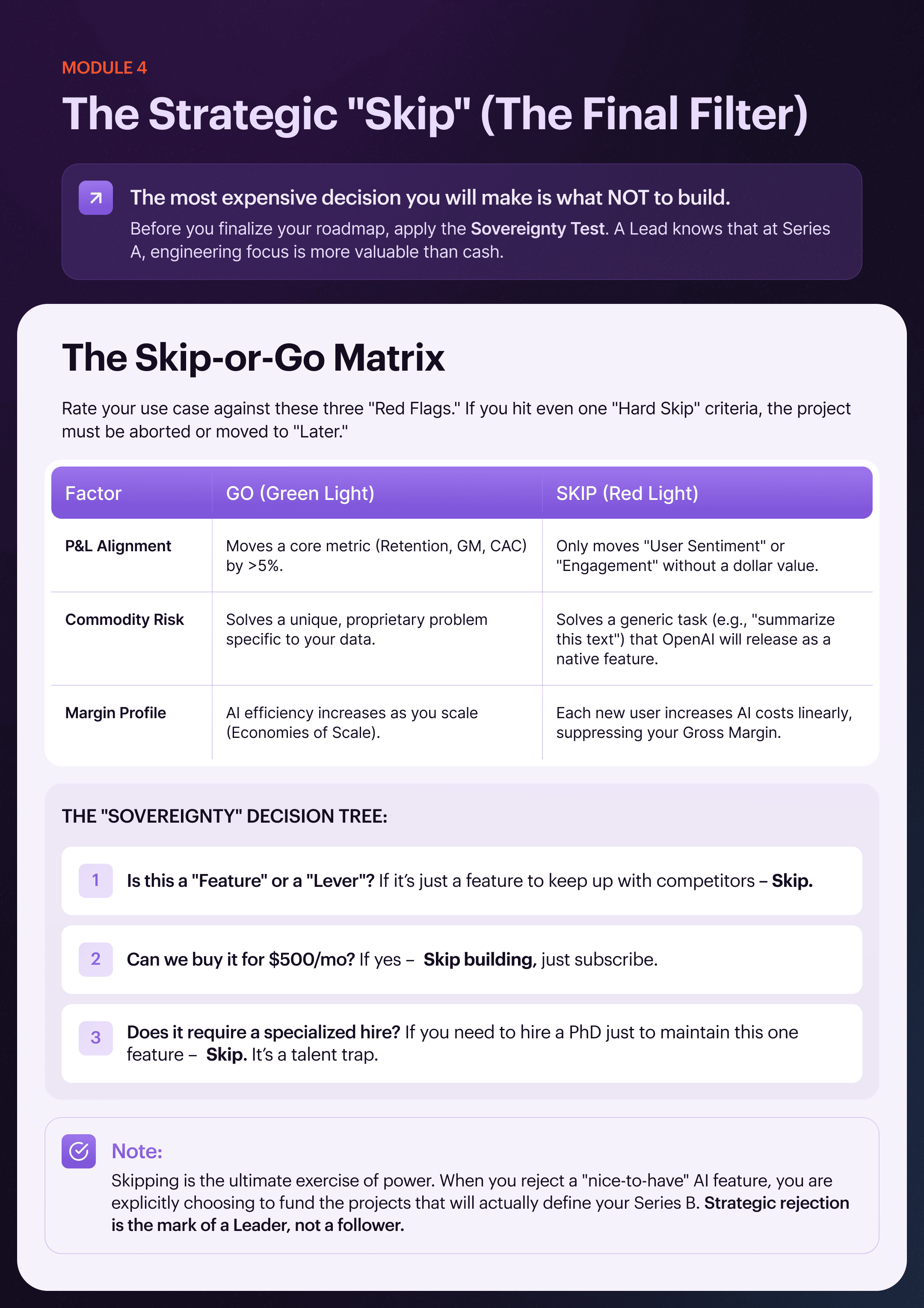 Building a feature with no Durable Moat is a risk to capital efficiency. We advise caution with implementations where operational costs scale linearly without a path to Economies of Scale. At Series A, Engineering Focus is your rarest resource; it is best directed toward initiatives that fundamentally inflate your Institutional Valuation.