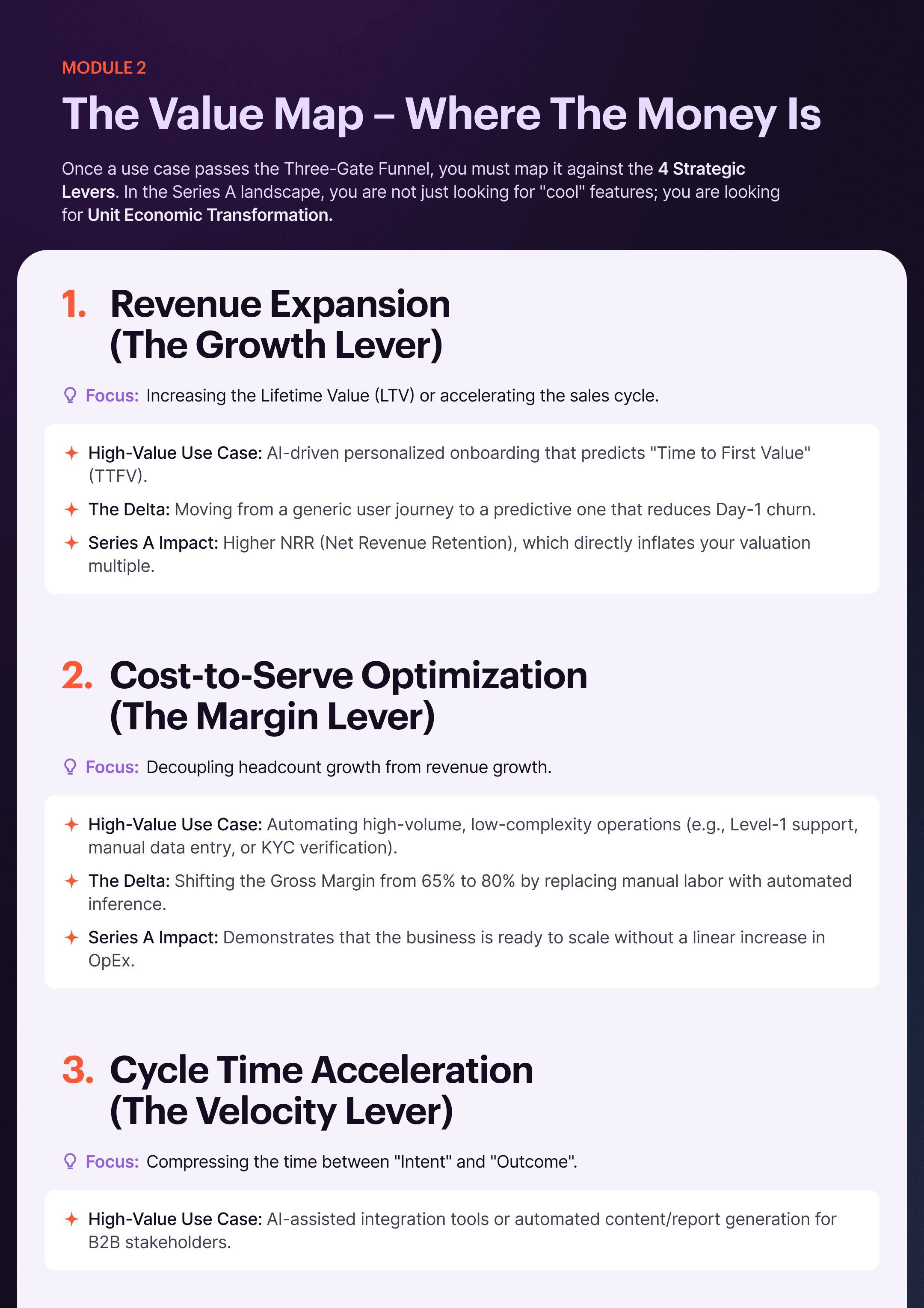 Prioritize Money Levers over "cool" features. We focus on repeatable, high-volume actions close to cash: Revenue Expansion (predictive upsells), Cost-to-Serve reduction (automated operations), and Cycle-Time Compression. If it doesn't move Retention or Gross Margin, it stays in the parking lot.