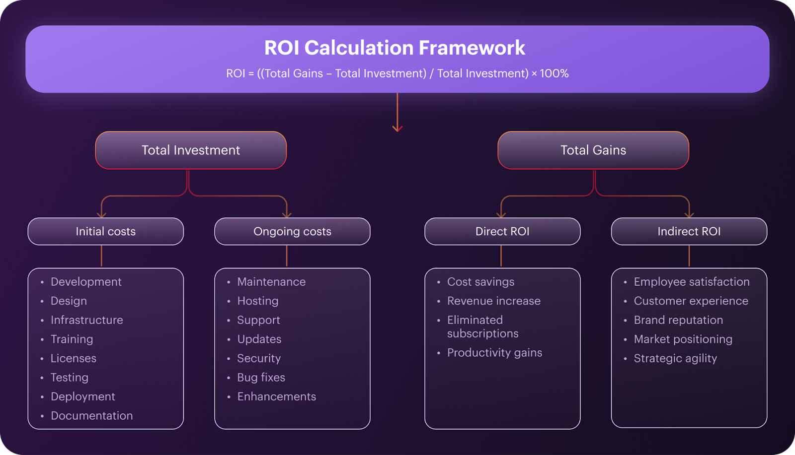 ROI in software development measures the financial and operational value generated relative to development costs: