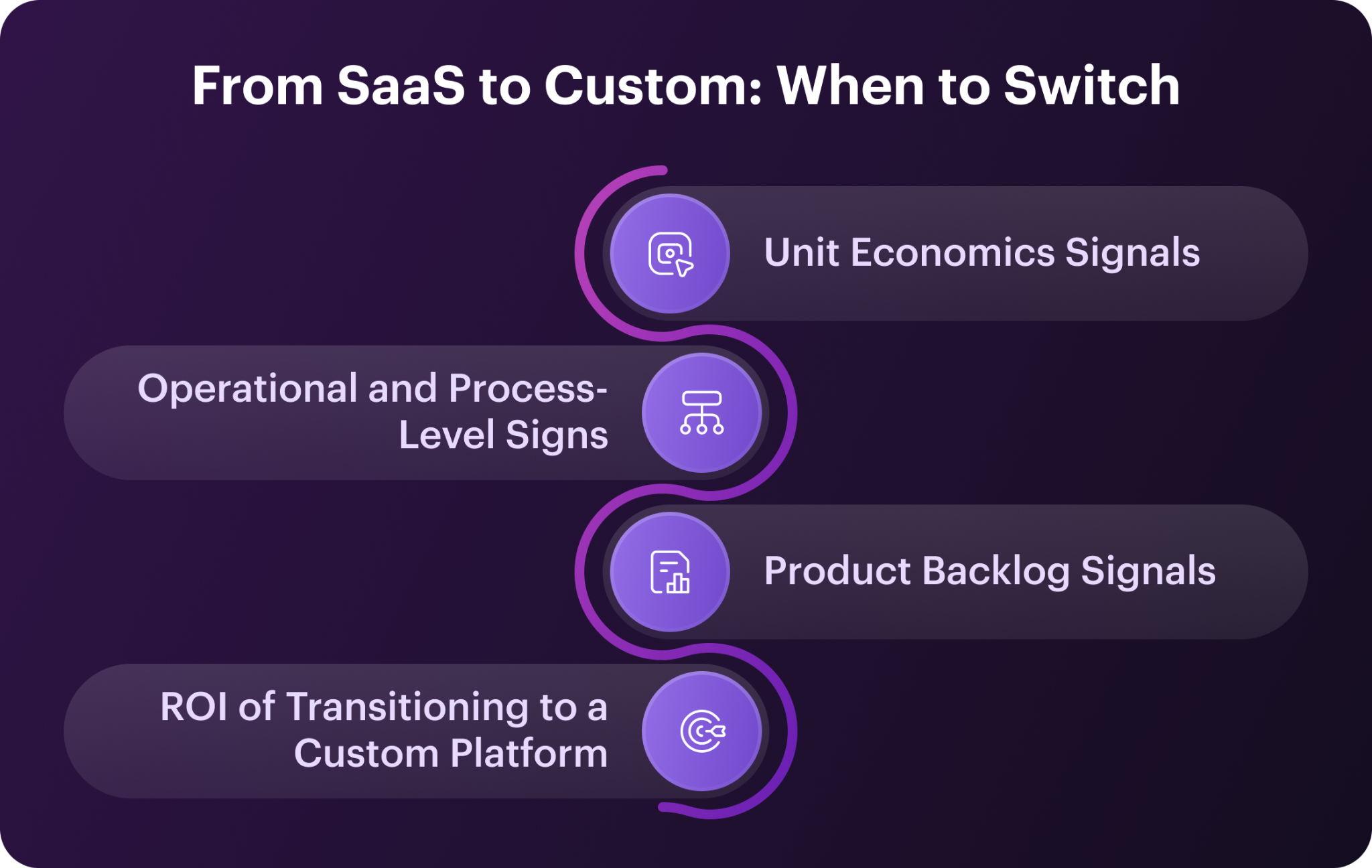 When operational friction costs exceed the potential investment in custom development, the transition becomes economically justified. At this point, comparing ongoing inefficiencies with the full custom software development cost provides a clearer basis for decision-making. The warning signs can include using multiple tools for single workflows and building custom scripts to connect SaaS products. Custom platforms enable workflows and experiences that off-the-shelf products cannot deliver.