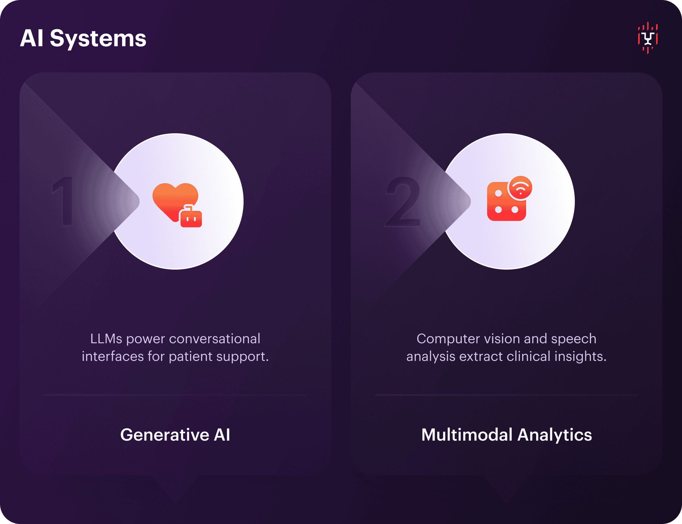 Emerging generative and multimodal systems represent the current innovation frontier. They utilize large language models and sensor fusion to create more naturalistic interactions and capture richer clinical signals. Large language models (LLMs) power conversational interfaces for patient support and assessment. Computer vision and speech analysis extract digital biomarkers from non-traditional data streams.