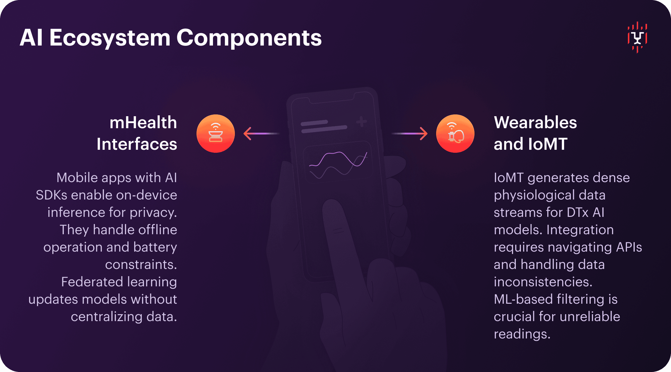 A supporting AI ecosystem does not directly implement therapeutic algorithms. It provides the data infrastructure and user touchpoints that enable DTx AI to function in real-world settings. This layer handles data collection, quality assurance, and integration. Mobile app frameworks, wearables, and IoMT devices make AI usable and feed these models.