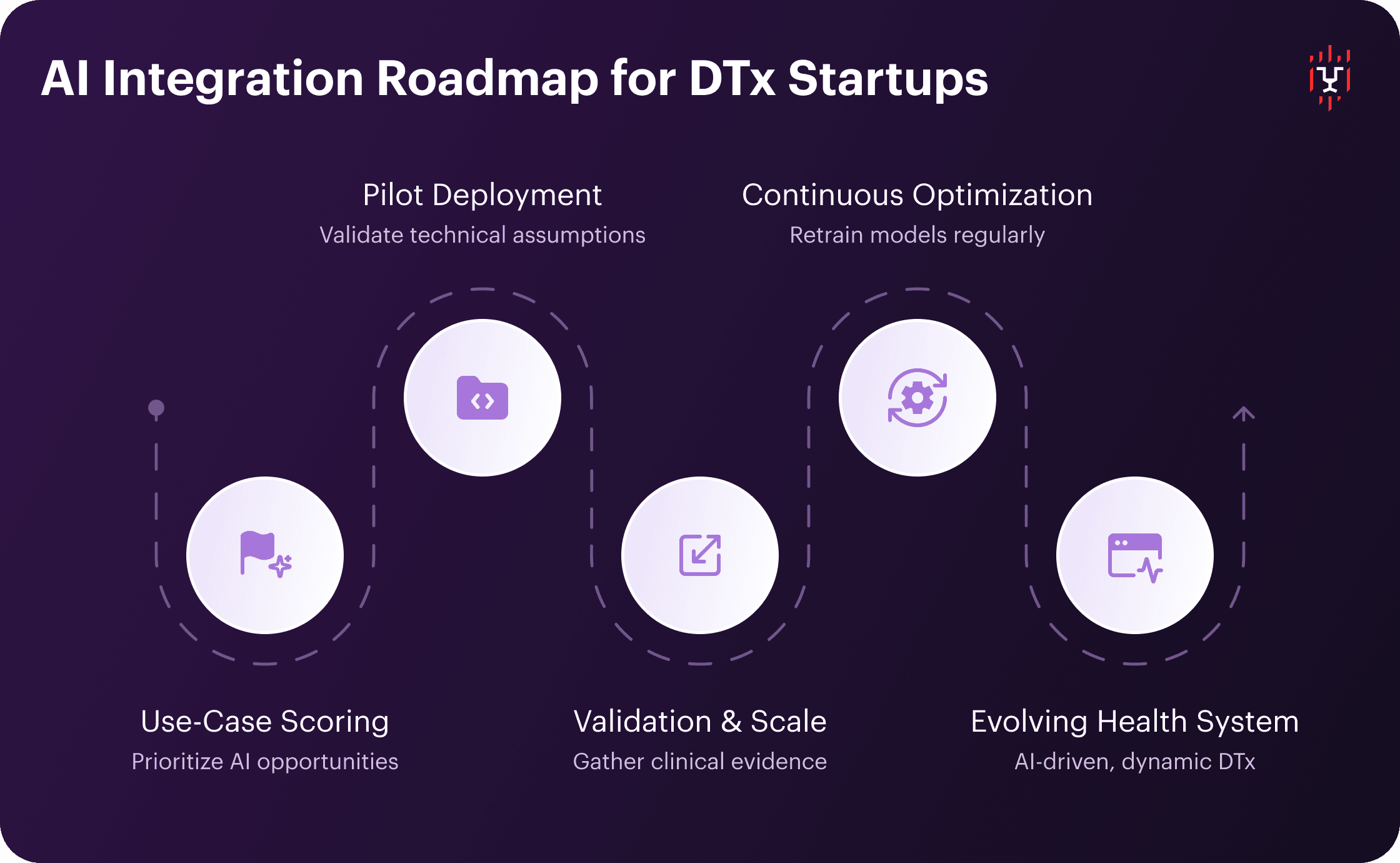 Deploying AI technologies in digital therapeutics requires a structured phasing. Companies are to balance technical stack, clinical validation requirements, regulatory expectations, and risk mitigation. The four-phase approach below reflects patterns that have proven to be efficient.