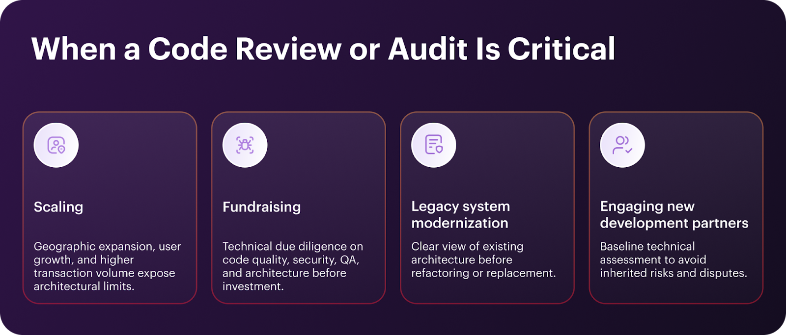 - Scaling. Geographic expansion, user base growth, and increases in transaction volume expose architectural limitations. Audits identify whether systems can handle projected load or require architectural modifications.