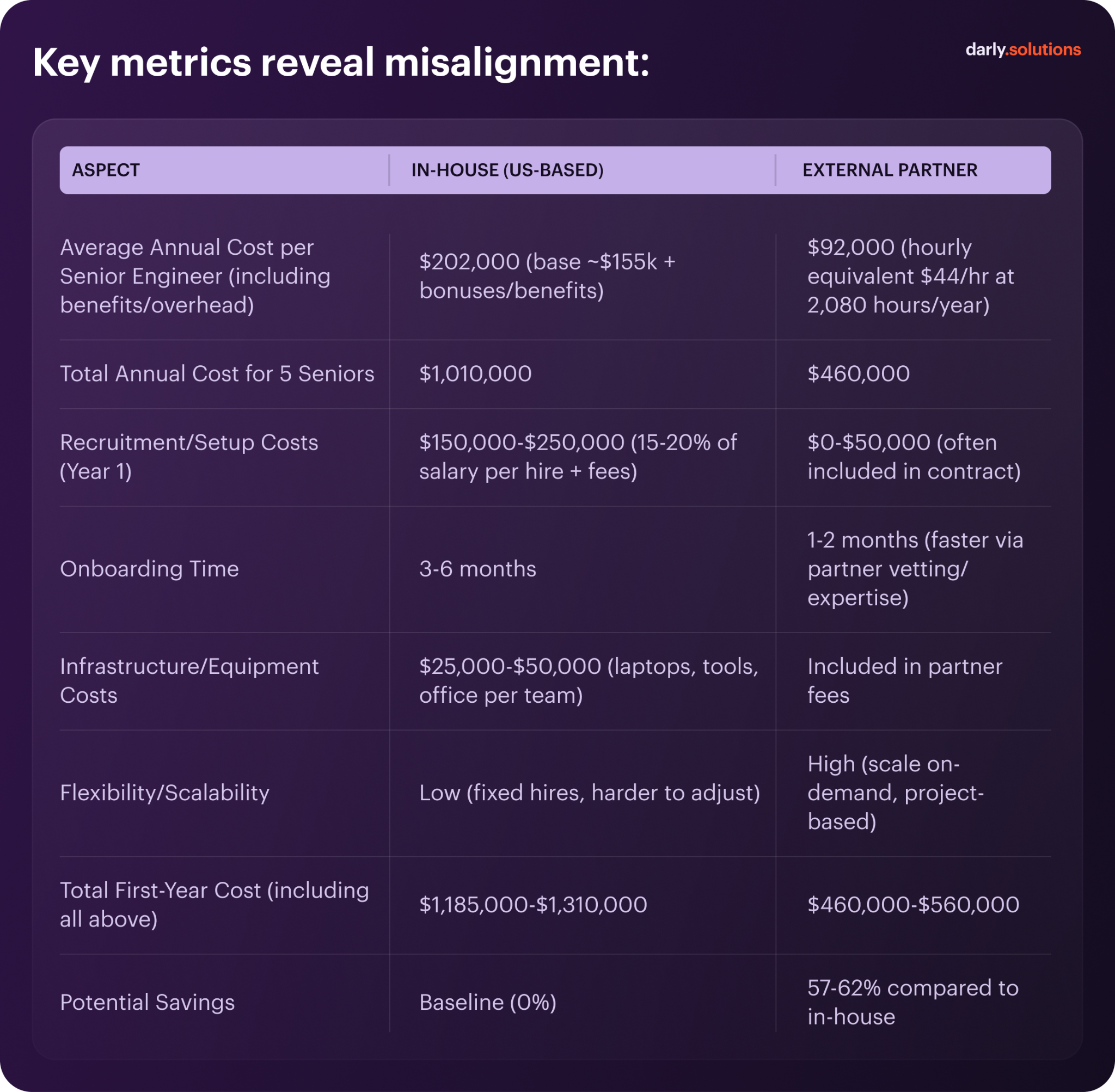 The comparison highlights a structural difference in how capacity is built. Full-time hiring increases fixed cost and extends ramp time, while an external partner model concentrates spend on active delivery and shortens time to contribution.