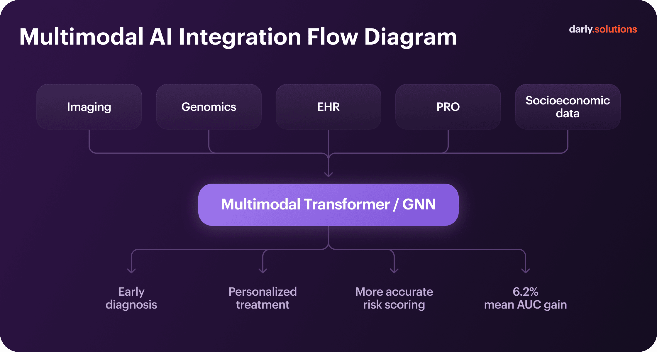 Multimodal AI models consistently outperform single-source approaches. Transformer models and graph neural networks excel at working in combination. They model relationships between disparate data — anatomical structures in imaging, genetic markers, and clinical parameters. Each modality answers different clinical questions. Combining them generates predictions that no single data type supports alone.