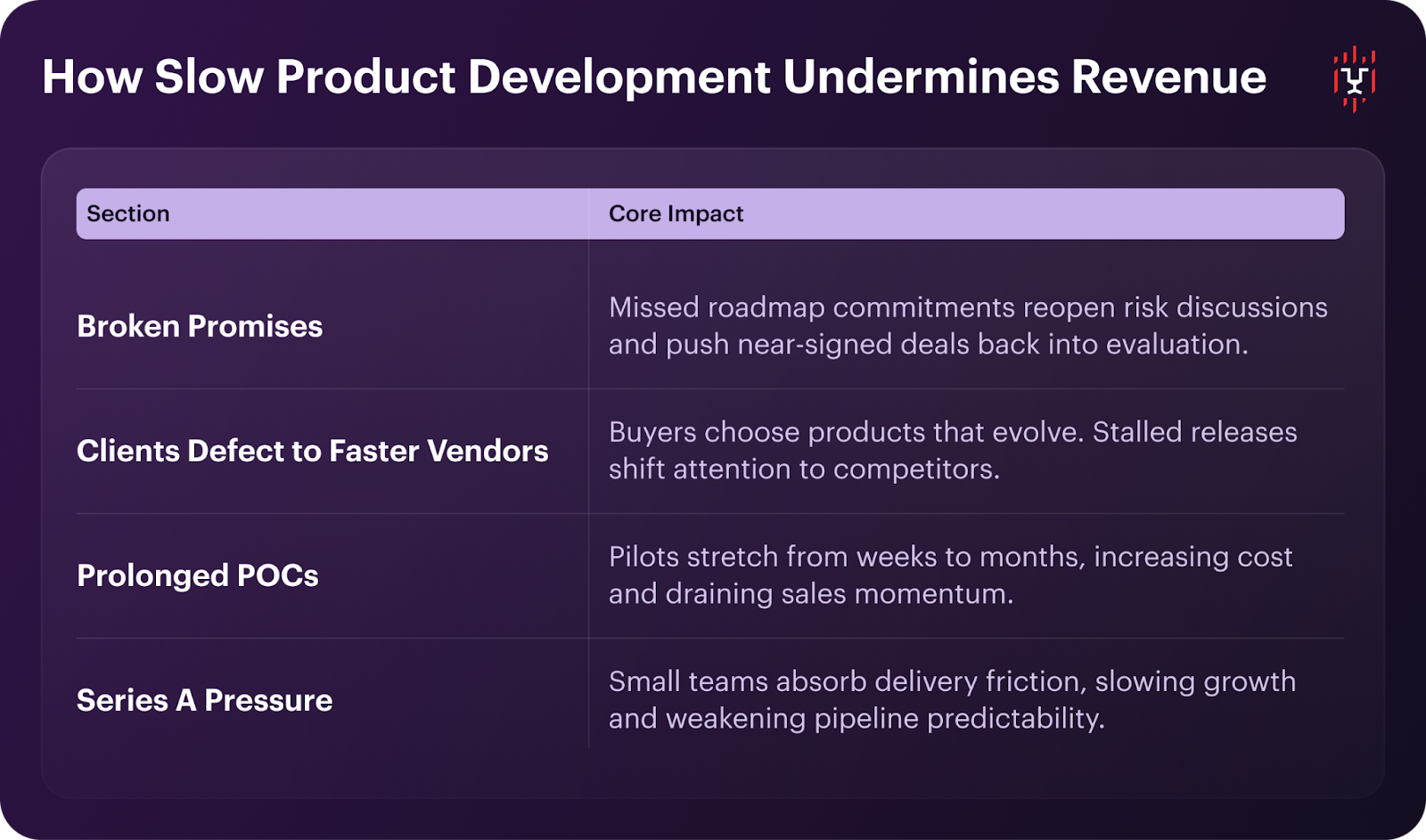When delivery is embedded into the operating model, buyers observe consistent roadmap progress during active evaluations, feedback incorporated within the same quarter, clear ownership over release timelines, and steady movement from pilot to production. The opposite pattern is equally visible and it costs deals.
